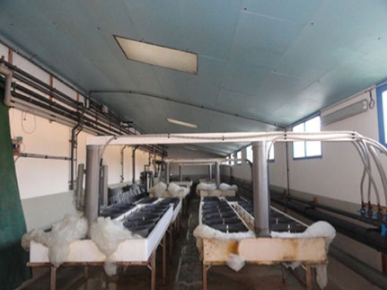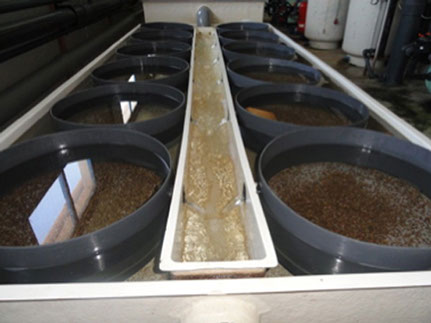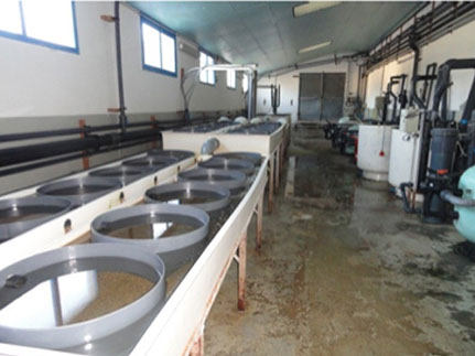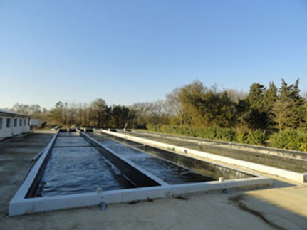 Huit ilots de 24 tamis qui tournent en circuit ouvert alimentée par l’eau de l’étang, plus du phytoplancton cultivé dans des raceways